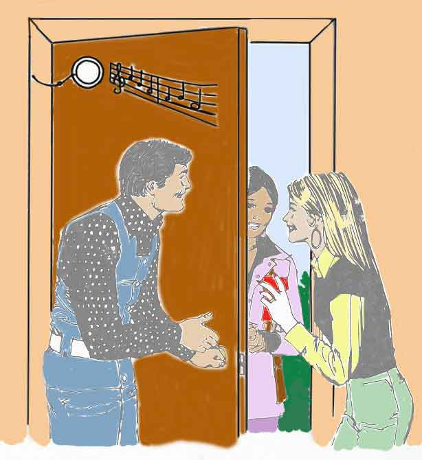 18 Note Wind Up Musical Door Chime/Music Box. Can be used as door chime or alone as a music box. Pull string to play. 4 inch diameter by 2 inches high. Comes with hardware to mount.