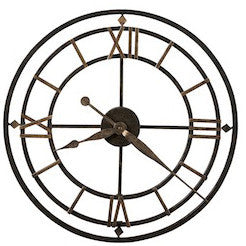 This antique style wrought iron wall clock is finished in aged iron with antique gold finished outer ring. Antique gold finished diamond shapes and Roman numerals mark the 12, 3, 6, and 9 hours. Antique gold hour and minute hands. Quartz, battery operated movement.